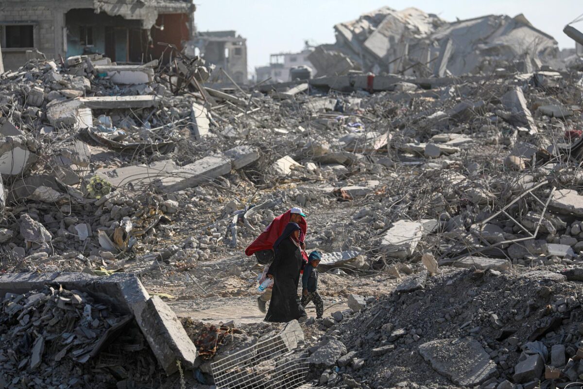 GAZA CITY (—), 11/10/2025.- Internally displaced Palestinians walk along a street among the rubble of destroyed buildings amid a ceasefire between Israel and Hamas, in Gaza City, 11 October 2025. US President Donald Trump announced that Israel and Hamas have agreed to the first phase of a Gaza peace plan. The deal involves the release of Israeli hostages and Palestinian prisoners, the withdrawal of Israeli forces, and the delivery of humanitarian aid to Gaza. EFE/EPA/MOHAMMED SABER