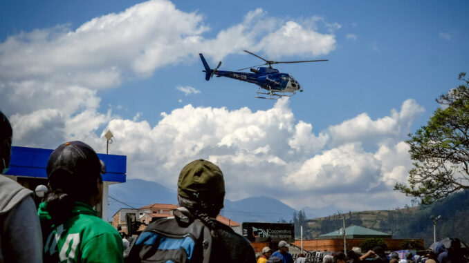 Manifestantes observan un helicóptero de la Policía de Ecuador este miércoles, durante una manifestación, en Otavalo (Ecuador). El Gobierno de Ecuador alcanzó una tregua con los dirigentes indígenas que lideraban las protestas contra el presidente Daniel Noboa en la provincia de Imbabura, el epicentro de las movilizaciones, lo que no fue avalado por parte de las comunidades, quienes abogan por mantener los bloqueos de carreteras tras registrarse un segundo manifestante fallecido presuntamente por disparos de las fuerzas estatales.EFE/ Washington Benalcázar
