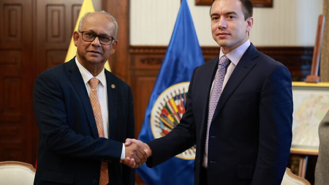 El secretario de la OEA dijo puso a disposición de Ecuador “la totalidad de los programas, proyectos de la OEA y experiencia técnica con el objetivo prevenir el delito, con el objetivo de fortalecer las capacidades de sus instituciones para prevenir el delito, perseguir a las organizaciones criminales y proteger integralmente a su población en el marco de la cooperación internacional y el respeto al Estado de derecho».