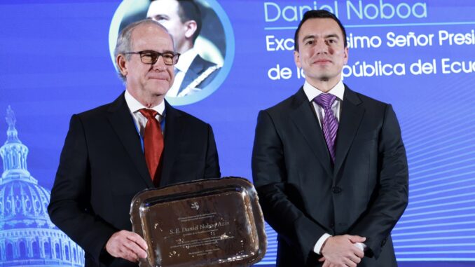 Noboa aprovechó el espacio para destacar los avances económicos y sociales alcanzados, la reducción de la pobreza y el riesgo país, así como el fortalecimiento de la lucha contra el narcotráfico y la minería ilegal.