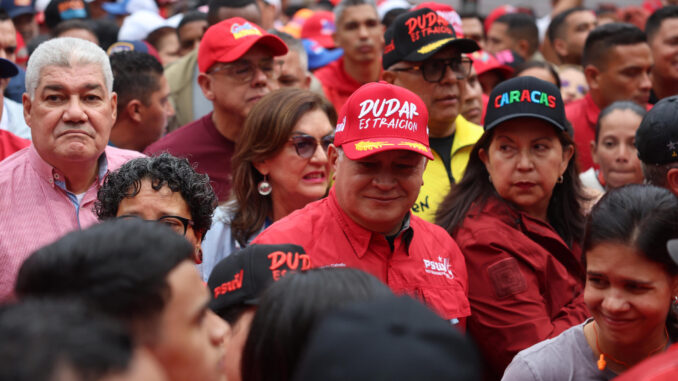 El ministro de Relaciones Interiores, Justicia y Paz de Venezuela, Diosdado Cabello (c) participa en una manifestación del Partido Socialista Unido de Venezuela en el marco de la Lucha Antiimperialista este lunes, en Caracas (Venezuela). Los Comandos de Comunidad Bolivariana de Base Integral se dirigen a su Gran Juramentación. EFE/ Miguel Gutiérrez