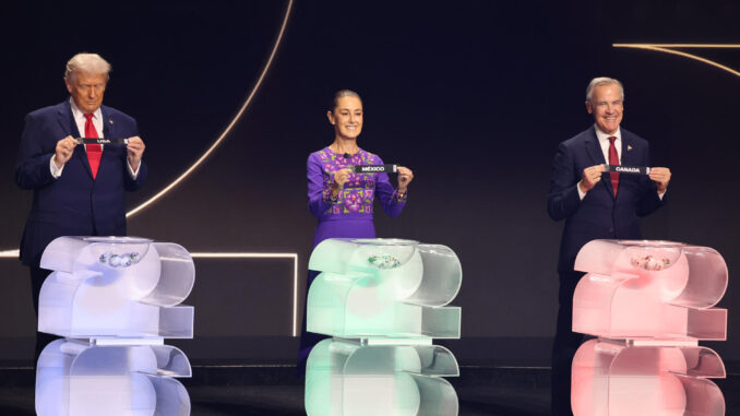 El presidente de Estados Unidos, Donald Trump (i); la presidenta de México, Claudia Sheinbaum (c), y el primer ministro de Canadá, Mark Carney, posan durante el sorteo del Mundial de Fútbol FIFA 2026 este viernes, en el Kennedy Center de Washington (Estados Unidos). EFE/ Octavio Guzmán