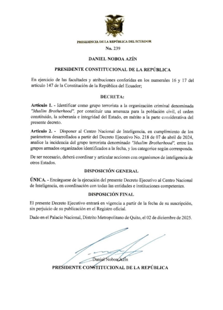En un paso descrito como el más firme en la historia del país contra las organizaciones transfronterizas, el presidente ecuatoriano Daniel Noboa anunció la clasificación del grupo de los Hermanos Musulmanes como «organización terrorista», considerándolo una amenaza directa para la seguridad nacional y para los civiles dentro de Ecuador.