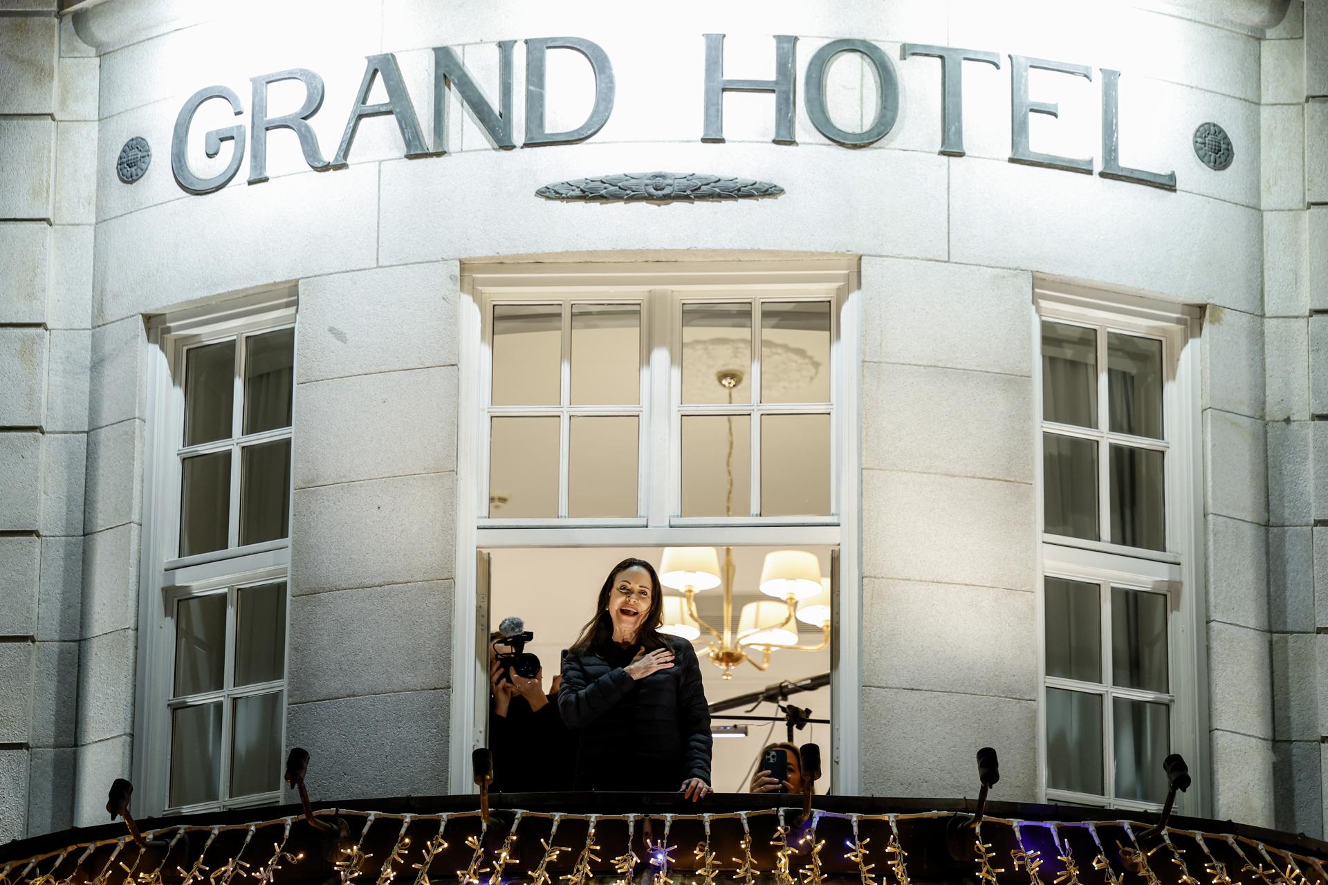 La Premio Nobel de la Paz, María Corina Machado, reacciona desde el balcón del Grand Hotel de Oslo, Noruega, el 11 de diciembre de 2025. Recibió el Premio Nobel de la Paz 2025 por su incansable labor en la promoción de los derechos democráticos del pueblo venezolano y por su lucha para lograr una transición justa y pacífica de la dictadura a la democracia. Debido a la situación en Venezuela, no pudo asistir a la ceremonia de entrega de premios. (Noruega) EFE/EPA/JONAS BEEN HENRIKSEN