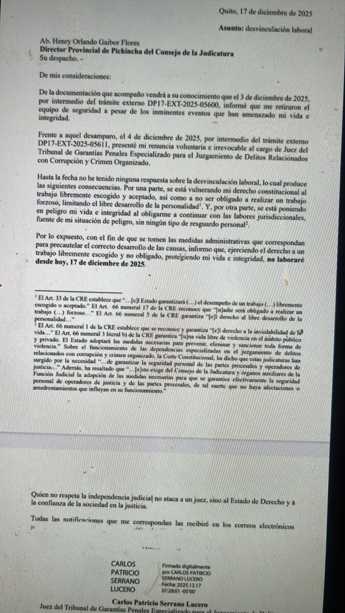 El juez anticorrupción Carlos Serrano, uno de los integrantes del Tribunal de Juicio del Caso Triple A, en que la Fiscalía acusa al alcalde de Guayaquil, Aquiles Álvarez, ha presentado su renuncia irrevocable, tras denunciar «inminentes eventos que han amenazado su vida y su integridad».
