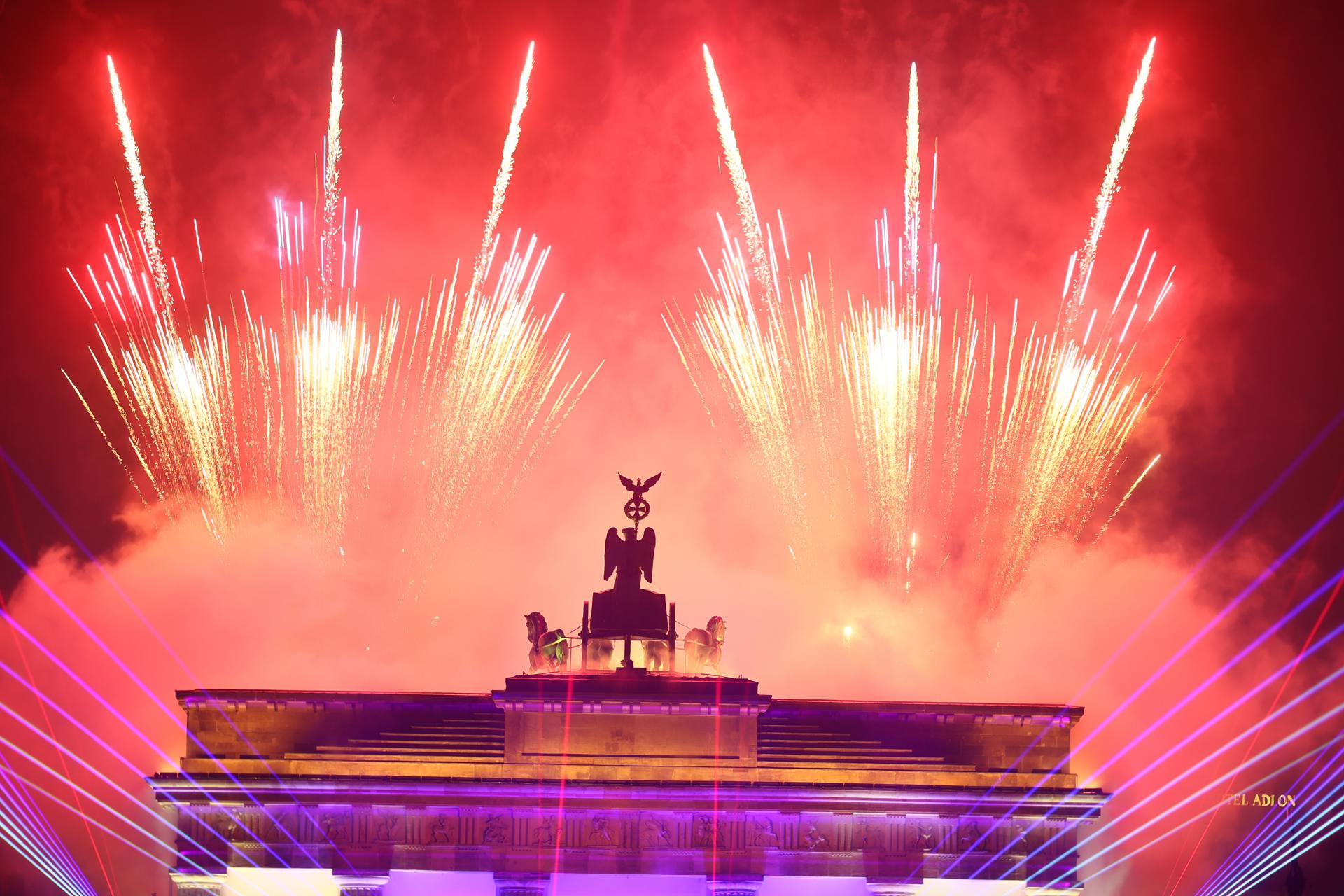 Fuegos artificiales iluminan el cielo sobre la estatua de la Cuadriga de la Puerta de Brandeburgo durante las celebraciones de Nochevieja en Berlín, Alemania, el 1 de enero de 2026. EFE/EPA/HANNIBAL HANSCHKE