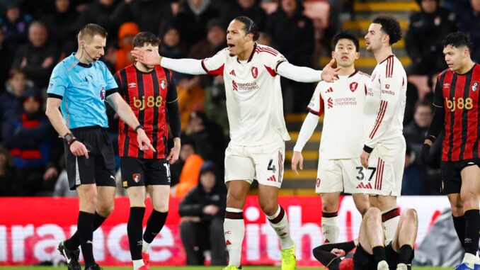 BOURNEMOUTH (United Kingdom), 24/01/2026.- Virgil van Dijk of Liverpool (C) argues with the referee Michael Salisbury (L) during the English Premier League match between AFC Bournemouth and Liverpool FC, in Bournemouth, Britain, 24 January 2026. (Reino Unido) EFE/EPA/TOLGA AKMEN EDITORIAL USE ONLY. No use with unauthorized audio, video, data, fixture lists, club/league logos, 'live' services or NFTs. Online in-match use limited to 120 images, no video emulation. No use in betting, games or single club/league/player publications.