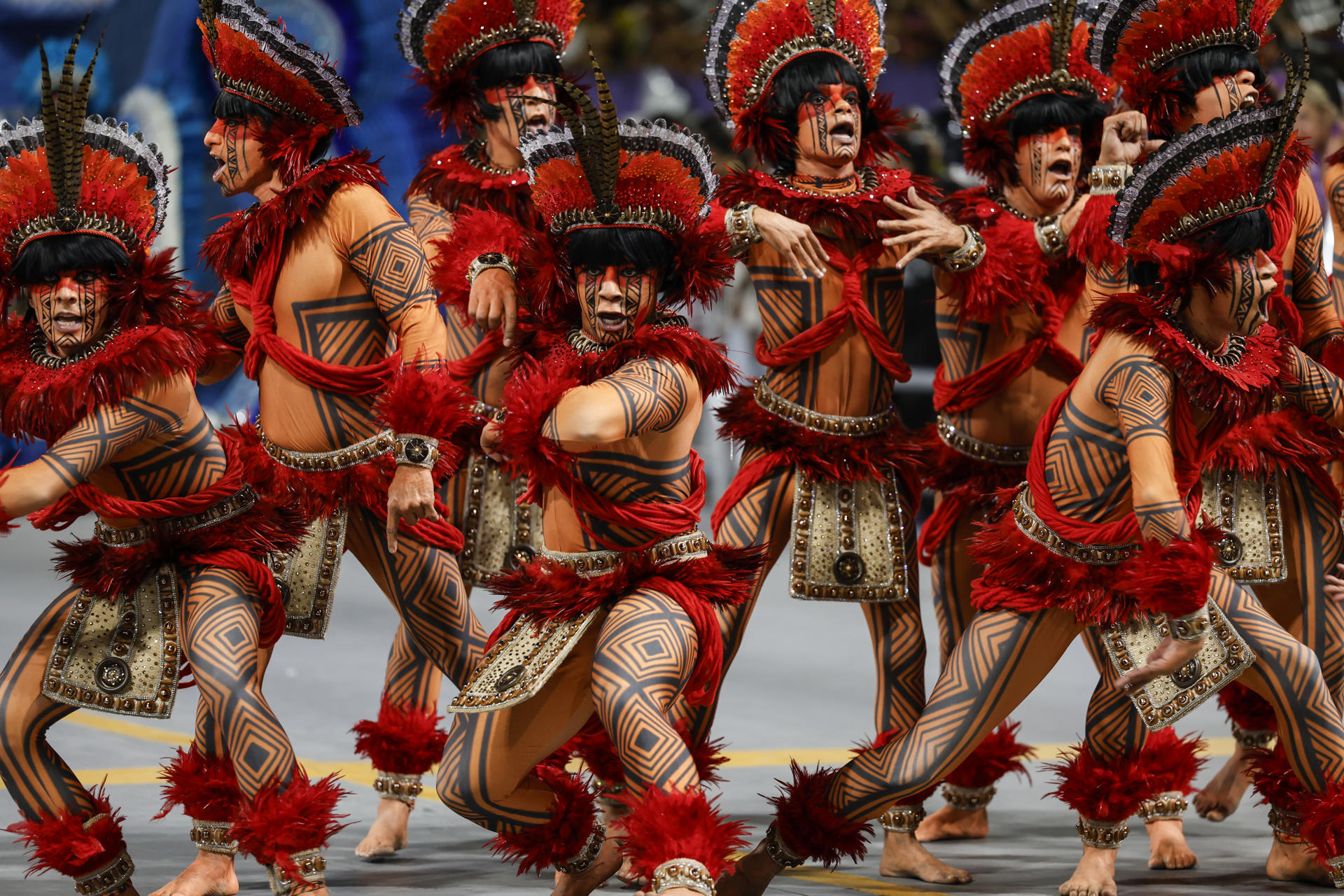 Integrantes de la escuela de samba Gaviões da Fiel desfila este domingo, en el segundo día de los desfiles del Grupo Especial en el sambódromo de Anhembí en Sao Paulo (Brasil). EFE/ Sebastiao Moreira