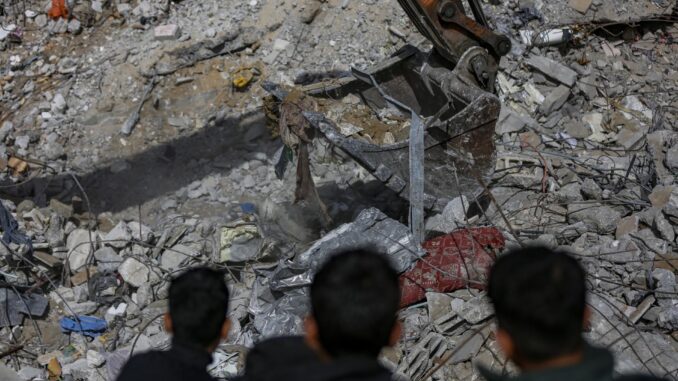 BEIT LAHIA (---), 15/02/2026.- Palestinian civil defense teams iworking to recover the remains of 67 members of the Abu Nasr family from beneath the rubble of their home after it was destroyed in an Israeli airstrike in Beit Lahia, north of Gaza City, 15 February 2026. EFE/EPA/MOHAMMED SABER