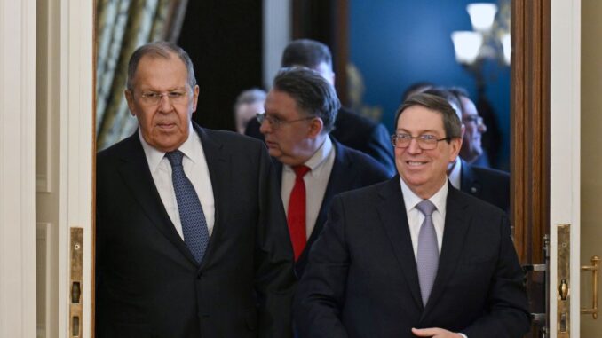 El ministro de exteriores ruso Serguéi Lavrov junto a su homólogo cubano Bruno Rodríguez en Moscú, Rusia el 18 de febrero de 2026. EFE/EPA/HECTOR RETAMAL
