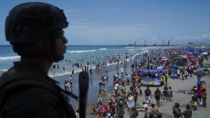Manta, lunes 16 de febrero del 2026 Durante los dias del feriado de carnaval, soldados del Grupo de Operaciones Militares de Ámbito Interno "Manabí" brindan seguridad a los turistas que acudieron a la playa del Murciélago en Manta. Fotos: César Muñoz/API