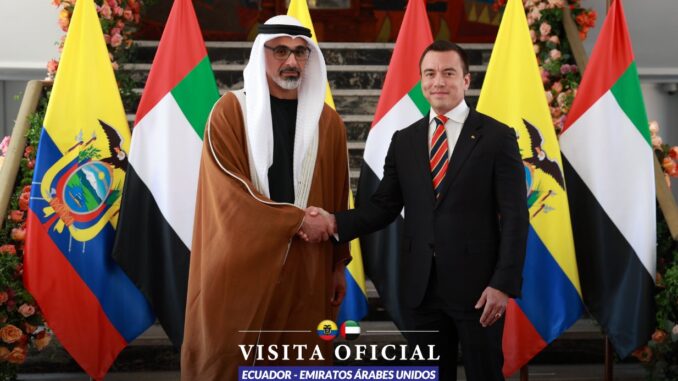 Con la visita del príncipe heredero de Abu Dabi, Khaled Bin Mohamed Bin Zayed y el presidente Daniel Noboa, Ecuador y Emiratos Árabes Unidos firmaron una serie de memorándums de entendimiento en temas de comercio, inversión, defensa, lucha contra la corrupción y en temas de seguridad.