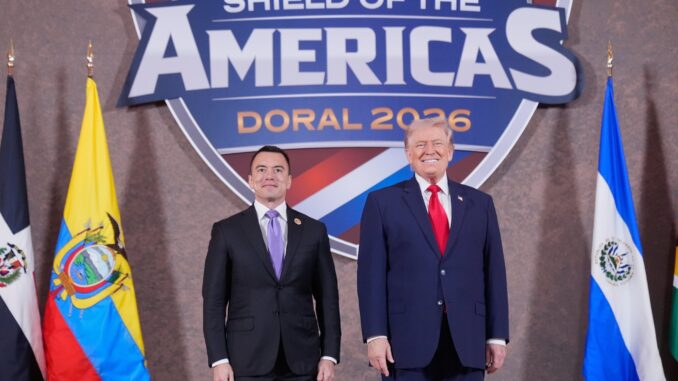 Tras la cita con Trump, Noboa se reunió con supervisora de la estratega del ‘Escudo de las Américas’, Kristi Noem -recién cesada secretaria de Seguridad Nacional de Estados Unidos-, y asistió a un encuentro con el secretario de Estado de EE.UU., Marco Rubio; Noem, y los presidentes de los otros países.