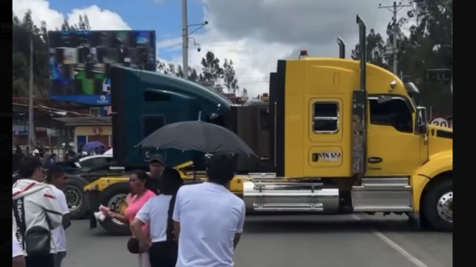 Camiones bloquean la carretera que conduce l puente de Rumichaca, en el lado de Ipiales, contra la guerra de aranceles del presidente Daniel Noboa contra Colombia.