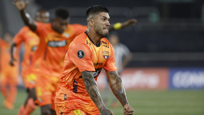 Milton Céliz de Barcelona SC celebra un gol este martes, en un partido de clasificación por la Copa Libertadores entre Botafogo y Barcelona SC en el estadio Olímpico Nilton Santos en Río de Janeiro (Brasil). EFE/ Antonio Lacerda