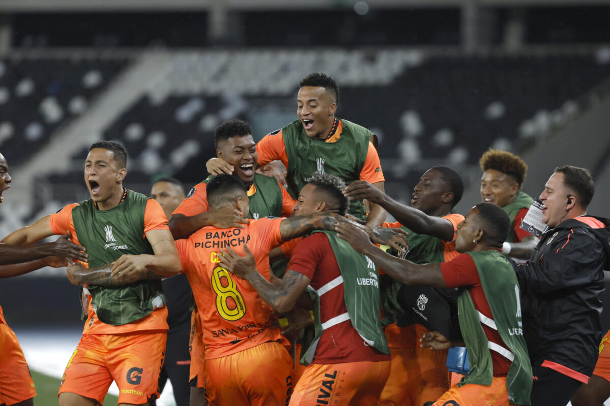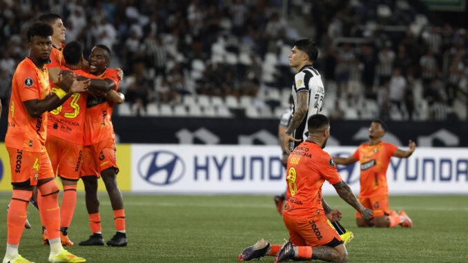 Jugadores de Barcelona SC celebran un gol este martes, en un partido de clasificación por la Copa Libertadores entre Botafogo y Barcelona SC en el estadio Olímpico Nilton Santos en Río de Janeiro (Brasil). EFE/ Antonio Lacerda