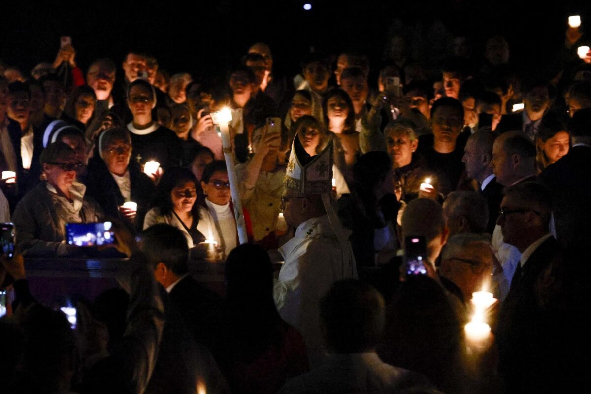 El papa estadounidense-peruano presidió por primera vez en su pontificado la Vigilia de Sábado Santo, una de las más largas de la tradición católica que se inició en una Basílica de San Pedro totalmente a oscuras y en silencio con el rito de la bendición del fuego y el encendido del cirio pascual.