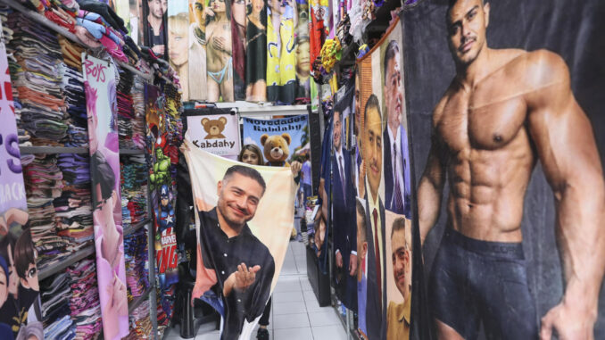 Vanesa, de Novedades Kabdahy, explica que estos productos personalizados están teniendo éxito porque «la gente lo ve (a Harfuch) como un superhéroe», sobre todo el público femenino de entre 40 a 50 años.