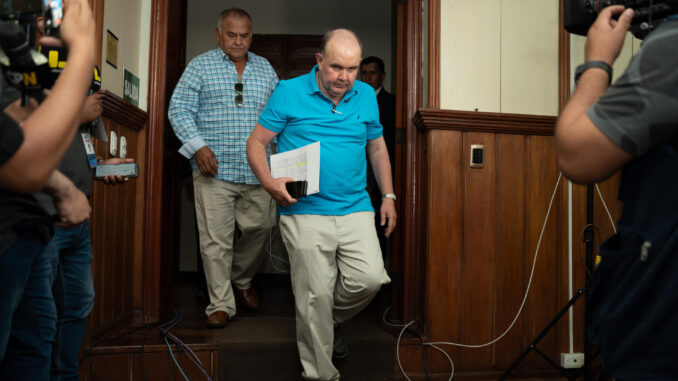 El candidato ultraconservador López Aliaga (c) llega a una rueda de prensa este domingo, en Lima (Perú). López Aliaga afirmó que las elecciones generales que se celebran en Perú "se han manchado" con la falta de material electoral en varios centros de votación de Lima y pidió que se convoque a elecciones complementarias "en el término de 24 horas". EFE/ John Reyes Mejia