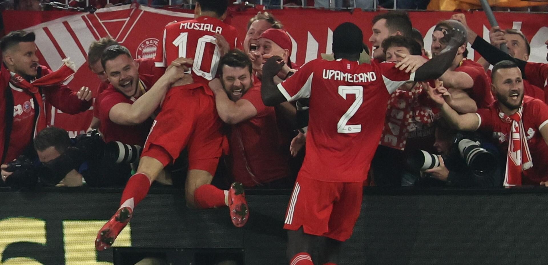 MÚNICH (Alemania), 15/04/2026.- Jamal Musiala (C-I) y Dayot Upamecano (C-D) del Bayern de Múnich celebran con los aficionados tras el partido de vuelta de los cuartos de final de la UEFA Champions League entre el FC Bayern de Múnich y el Real Madrid, en Múnich, Alemania, el 15 de abril de 2026. EFE/EPA/RONALD WITTEK