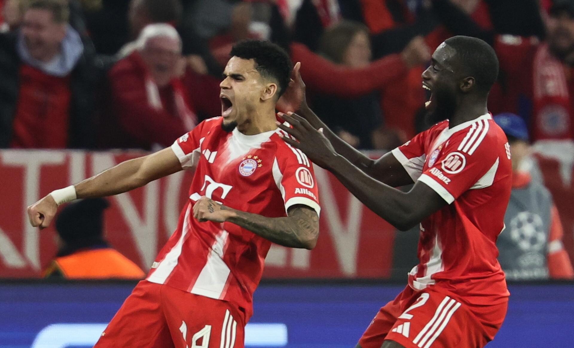 MÚNICH (Alemania), 15/04/2026.- Luis Díaz, del Bayern de Múnich, celebra con su compañero Dayot Upamecano (derecha) tras marcar el gol del empate 3-3 durante el partido de vuelta de los cuartos de final de la Liga de Campeones de la UEFA entre el FC Bayern de Múnich y el Real Madrid, en Múnich, Alemania, el 25 de abril de 2026. (Liga de Campeones, Alemania) EFE/EPA/RONALD WITTEK