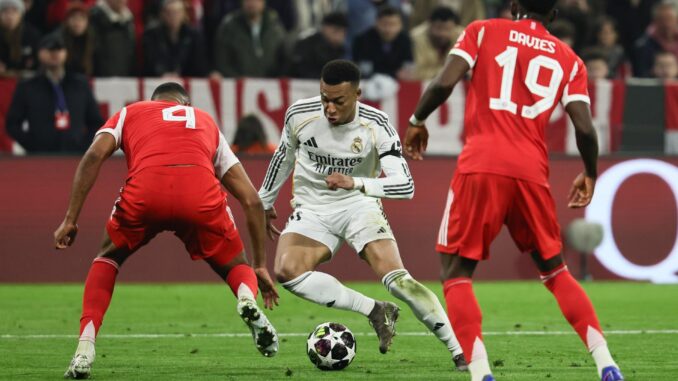 Kylian Mbappé del Real Madrid (C) en acción contra Jonathan Tah del Bayern de Múnich (I) junto a Alphonso Davies del Bayern de Múnich (D) durante el partido de vuelta de los cuartos de final de la Liga de Campeones de la UEFA contra el Bayern FC, Múnich, Alemania, 15 de abril de 2026. EFE/EPA/RONALD WITTEK