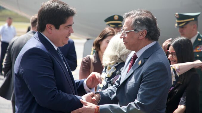 El presidente colombiano, Gustavo Petro, y Félix Wong, embajador extraordinario y plenipotenciario de Ecuador en Colombia, este sábado, 24 de mayo de 2025, en Quito, para participar en la investidura del presidente de la República reelecto, Daniel Noboa. Imagen extraída de la cuenta de la Cancillería ecuatoriana.