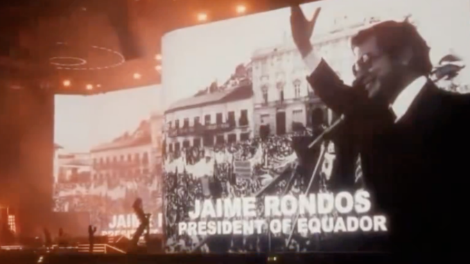 Mientras interpretaban la canción Oblivius, el grupo proyectó una serie de imágenes de líderes latinoamericanos cuyas muertes o derrocamientos han sido relacionados, según distintas teorías, con la intervención de Estados Unidos. Entre ellos apareció Roldós —aunque su nombre fue mostrado con un error tipográfico— junto a figuras como Salvador Allende, Jacobo Árbenz y Omar Torrijos.