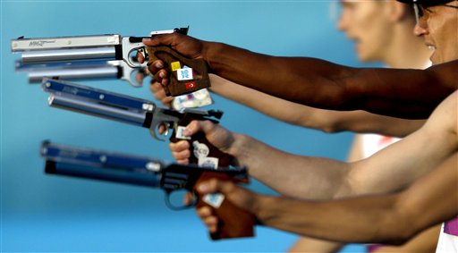 Foto de archivo, del 11 de agosto del 2012, de la competencia de tiro del pentatlón moderno de los Juegos Olímpicos de Londres. Esa disciplina podría ser eliminada de la justa a partir del 2020. (AP Photo/David Goldman, File)