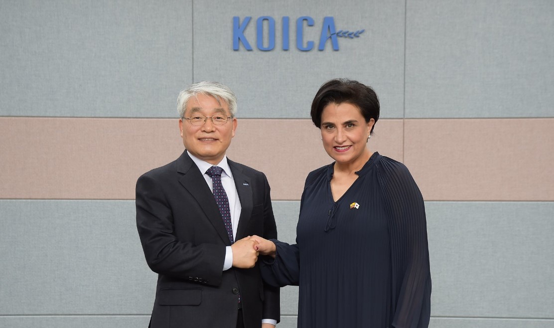 Gabriela Sommerfeld, la ministra de Relaciones Exteriores del Ecuador junto a Seok-Hwa Hong, el Vicepresidente de la Agencia de Cooperación Internacional de Corea (KOICA).
