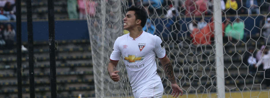 ECUADOR, Quito (13/03/2016) Edson Puch de Liga de Quito celebra su gol durante el partido contra Aucas en el campeonato nacional de de futbol Copa Pilsener, en el estadio Olimpico Atahualpa. FOTOS API / JUAN CEVALLOS.