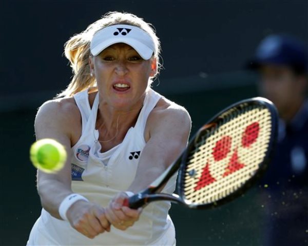En esta foto del 28 de junio de 2012, la británica Elena Baltacha hace una devolución a la checa Petra Kvitova, durante el torneo de Wimbledon. Balatcha falleció el domingo 4 de mayo de 2014, tras una larga lucha contra el cáncer (AP Foto/Kirsty Wigglesworth, archivo)