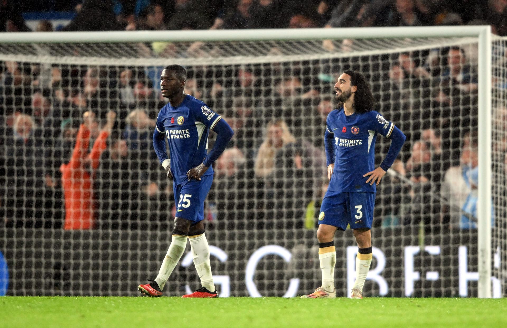 London (United Kingdom), 12/11/2023.- Chelsea players react during the English Premier League soccer match between Chelsea FC and Manchester City, in London, Britain, 12 November 2023. (Reino Unido, Londres) EFE/EPA/DANIEL HAMBURY No use with unauthorized audio, video, data, fixture lists, club/league logos, ‘live’ services’ or as NFTs. Online in-match use limited to 120 images, no video emulation. No use in betting, games or single club/league/player publications.
