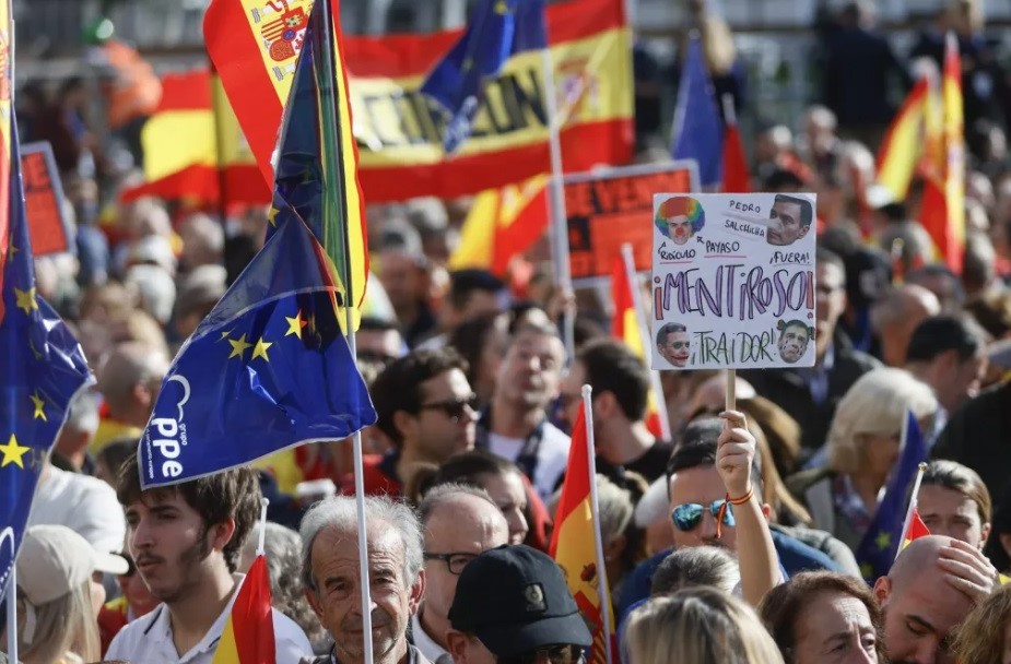 Decenas de personas se manifiestan contra la amnistía en la Puerta del Sol en Madrid. EFE/ Mariscal.
