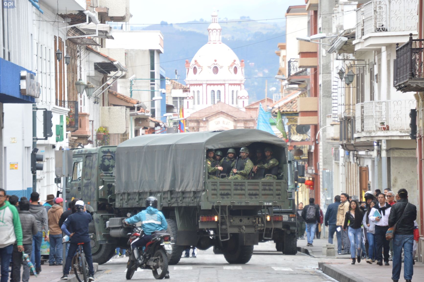 Cuenca, 3 de octubre del 2019. La tarde hoy militares llegaron al centro histórico de Cuenca para apoyar el estado excepción decretado por el gobierno. API/Boris Romoleroux
