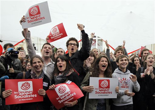 FRANCIA-ELECCIONES Jóvenes apoyando al Partido Socialista de Francia para las elecciones legislativas en París, el domingo 10 de junio de 2012. (Foto AP/Francois Mori)