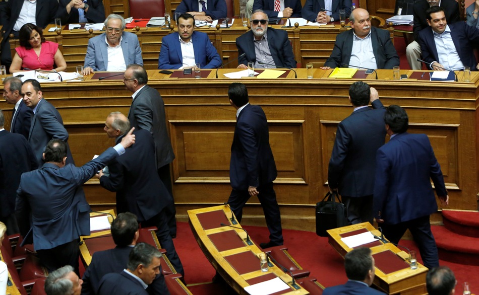 El primer ministro griego Alexis Tsipras, al fondo a la derecha, desvía la mirada mientras los legisladores del Partido Nueva Democracia, de derecha, salen de una sesión parlamentaria de emergencia para debatir el referendo propuesto por el gobierno en Atenas, la madrugada del domingo 28 de junio de 2015. El Parlamento aprobó el referendo en torno a un posible acuerdo con los acreedores internacionales del país. (Foto AP/Petros Karadjias)