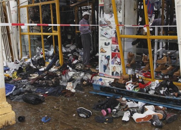 Prendas de vestir y calzado yacen en el suelo afuera de una tienda luego de una explosión ocurrida en una transitada calle del centro de Nairobi, Kenia, el lunes 28 de mayo de 2012. La policía informó que hubo 16 personas heridas en la explosión. (Foto AP/Sayyid Azim)