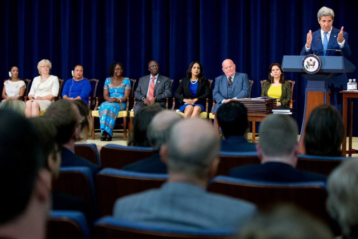 WASHINGTON. El secretario de Estado de Estados Unidos, John Kerry (d), asiste a una rueda de prensa en relación con el informe anual sobre el tráfico de personas en el mundo publicado por el Departamento de Estado, en presencia del ugandés Moses Bingoa (i), la británica Parosha Chandran (2-i), el estadounidense Tony Maddox (3-i), y el iraquí Saeed Hasan (2-d), en Washington, AP