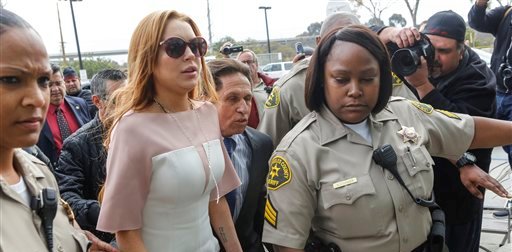Lindsay Lohan llega con su abogado Mark Heller a la Corte Superior de Los Angeles el lunes 18 de marzo de 2013. Lohan está acusada de tres cargos menores tras un choque en California y podría volver a prisión por violar su libertad condicional.  (Foto AP/Damian Dovarganes)