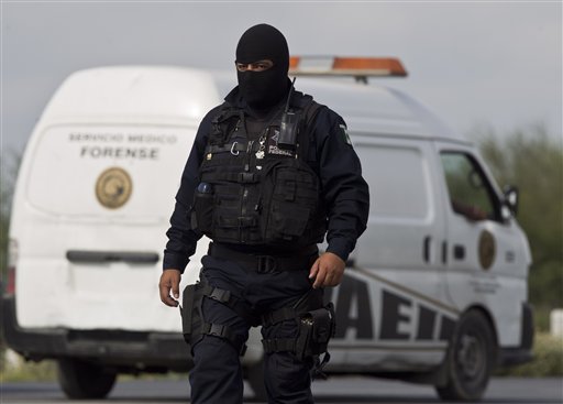 Un policía federal cuida la zona donde docenas de cuerpos, algunos de ellos mutilados, fueron encontrados en una carretera que comunica con la frontera de Estados Unidos, cerca de la ciudad industrial de Monterrey, México, el domingo 13 de mayo del 2012. (AP Foto/Christian Palma)