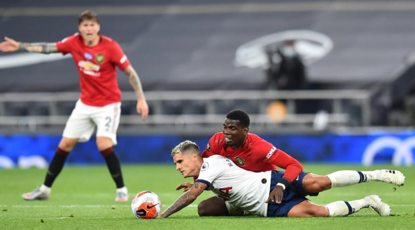 London (United Kingdom), 17/06/2020.- Tottenham Hotspur’s midfielder Erik Lamela (L) in action against Manchester United’s midfielder Paul Pogba (R) during the English Premier League soccer match between Tottenham Hotspur and Manchester United in London, Britain, 19 June 2020. (Reino Unido, Londres) EFE/EPA/GLYN KIRK / NMC / AFP POOL EDITORIAL USE ONLY. No use with unauthorized audio, video, data, fixture lists, club/league logos or ‘live’ services. Online in-match use limited to 120 images, no video emulation. No use in betting, games or single club/league/player publications.