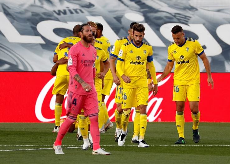 GRAF2561. MADRID, 17/10/2020.- >Los jugadores del Cádiz celebran tras marcar ante el Real Madrid, durante el partido de Liga en Primera División que disputan este sábado en el estadio Alfredo Di Stéfano. EFE/J.J. Guillén