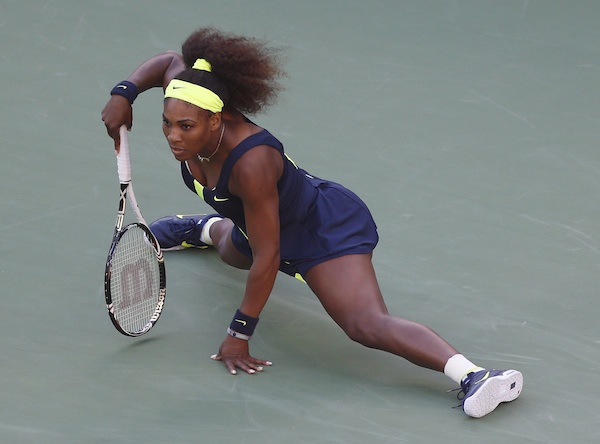 Serena Williams gets up after returning a shot to Victoria Azarenka, of Belarus, during the championship match at the 2012 US Open tennis tournament, Sunday, Sept. 9, 2012, in New York. (AP Photo/Kathy Willens)