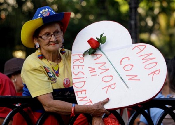 Una partidaria del presidente venezolano Hugo Chávez sostiene un cartel durante una concentración para festejar su regreso en la Plaza Bolívar de Caracas, lunes 18 de febrero de 2013. Chávez regresó el lunes por la madrugada desde Cuba, donde fue operado de cáncer hace más de dos meses. El mandatario no aparecfió en público y permanece, según autoridades, en un hospital militar de la capital. (AP Foto/Fernando Llano)