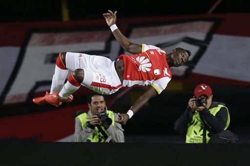 Yamilson Rivera celebra tras marcar el segundo gol en la victoria 2-0 de Independiente Santa Fe ante Estudiantes de la Plata en los octavos de final Copa Libertadores, el martes 12 de mayo de 2015. (AP Foto/Ricardo Mazalan)